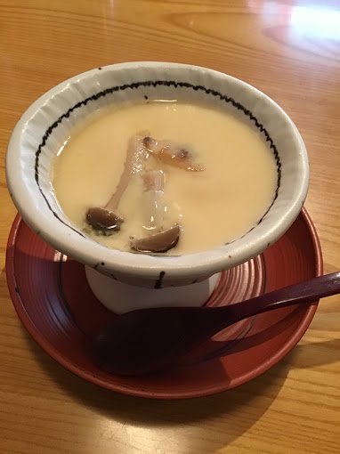 サラダの後は、出汁の香りが豊かな茶碗蒸しが登場します。特に、しめじの旨味がアクセントになっていて、上品な味わいが口の中に広がります。