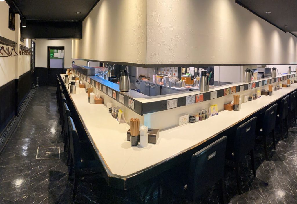 「麺処&酒家 蘭丸」は、白と黒を基調としたモダンな店内で、女性一人でも入りやすい雰囲気です。店内は清潔に保たれており、気持ちよく食事を楽しめます。