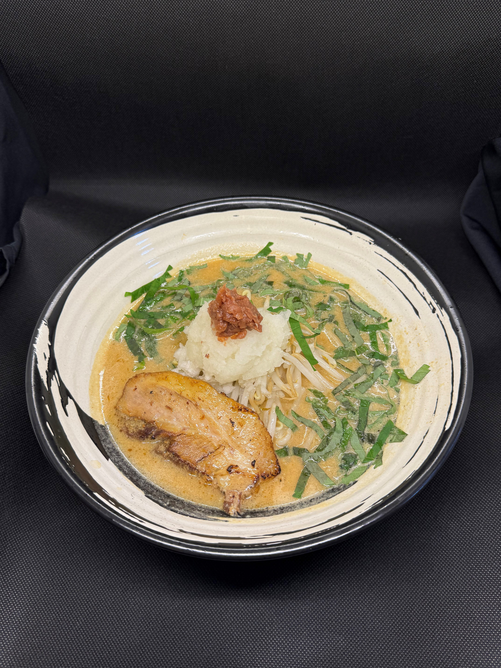 「麺処&酒家 蘭丸」の看板メニュー「みぞれらぁめん」は、梅の酸味と大葉の風味が食欲をそそる一杯です。大根おろしのシャキシャキとした食感も楽しく、さっぱりとしているのにコクのあるスープが後を引く美味しさです。