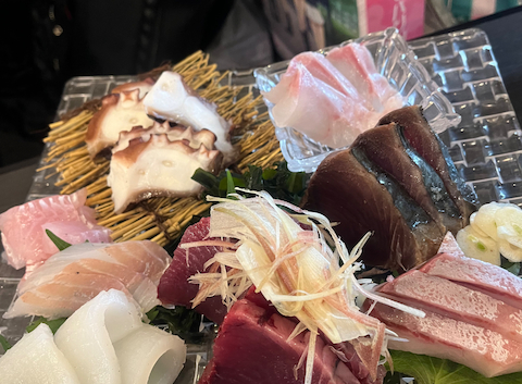 「漁師の孫の店 しげ康」の刺身は、鮮度抜群で種類豊富。カツオやカンパチ、タコなど、旬の魚介を贅沢に盛り合わせで楽しめます。
