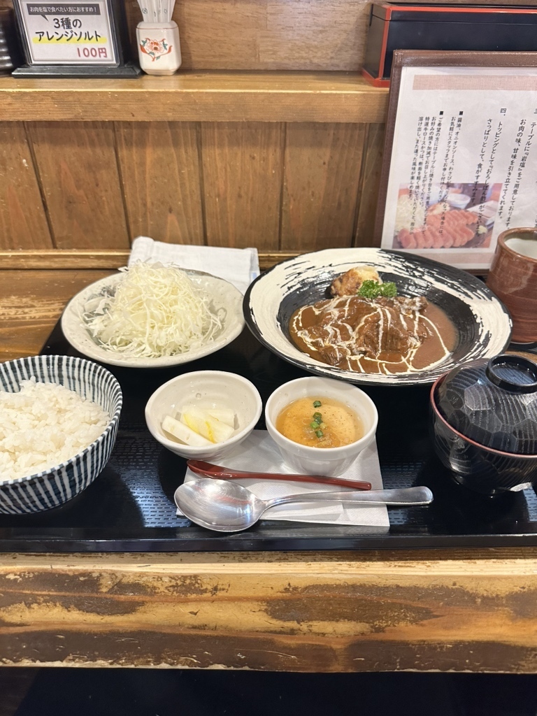 初めて訪れる人や、少しずつ色々試したいという方におすすめなのが「牛かつ定食」。日替わりで、ハーフサイズの牛カツ に加えて、牛煮込み などの一品料理が付いてくるお得なセットです。「今日は牛煮込みがセット」という口コミにもあるように、日によって違う味が楽しめるのも魅力。このセットでも、もちろん 3種類のタレ で牛カツを味わうことができます。ハーフサイズとはいえ、ボリュームも満点 で、「ハーフが普通に一人前あるだろと思える量でしっかり満足感があった」という声も。コスパの良さ も人気の理由の一つです。
