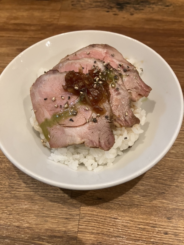 「麺処 青野」のラーメンは、スープや麺だけでなく、具材へのこだわりも半端ありません。例えば、醤油らぁめんには、柔らかく味が染み込んだメンマに加え、まさかのドライトマトがトッピングされています!これが意外にもスープと絶妙にマッチし、新しい味の発見に驚かされることでしょう。味玉も半熟で黄身の甘みが感じられ、一つ一つの具材が丁寧に仕事されているのが分かります。さらに、ラーメンのお供にぜひ試してほしいのが、サイドメニューの**「焼き豚ごはん」。これはもはや「ロースポーク丼」や「ステーキ丼」と呼ぶにふさわしい逸品で、ラーメンに負けず劣らずの完成度。小ぶりながらも食べ応えのある角煮ごはん**も人気で、ラーメンと一緒に頼んで、贅沢な定食気分を味わってみてください。