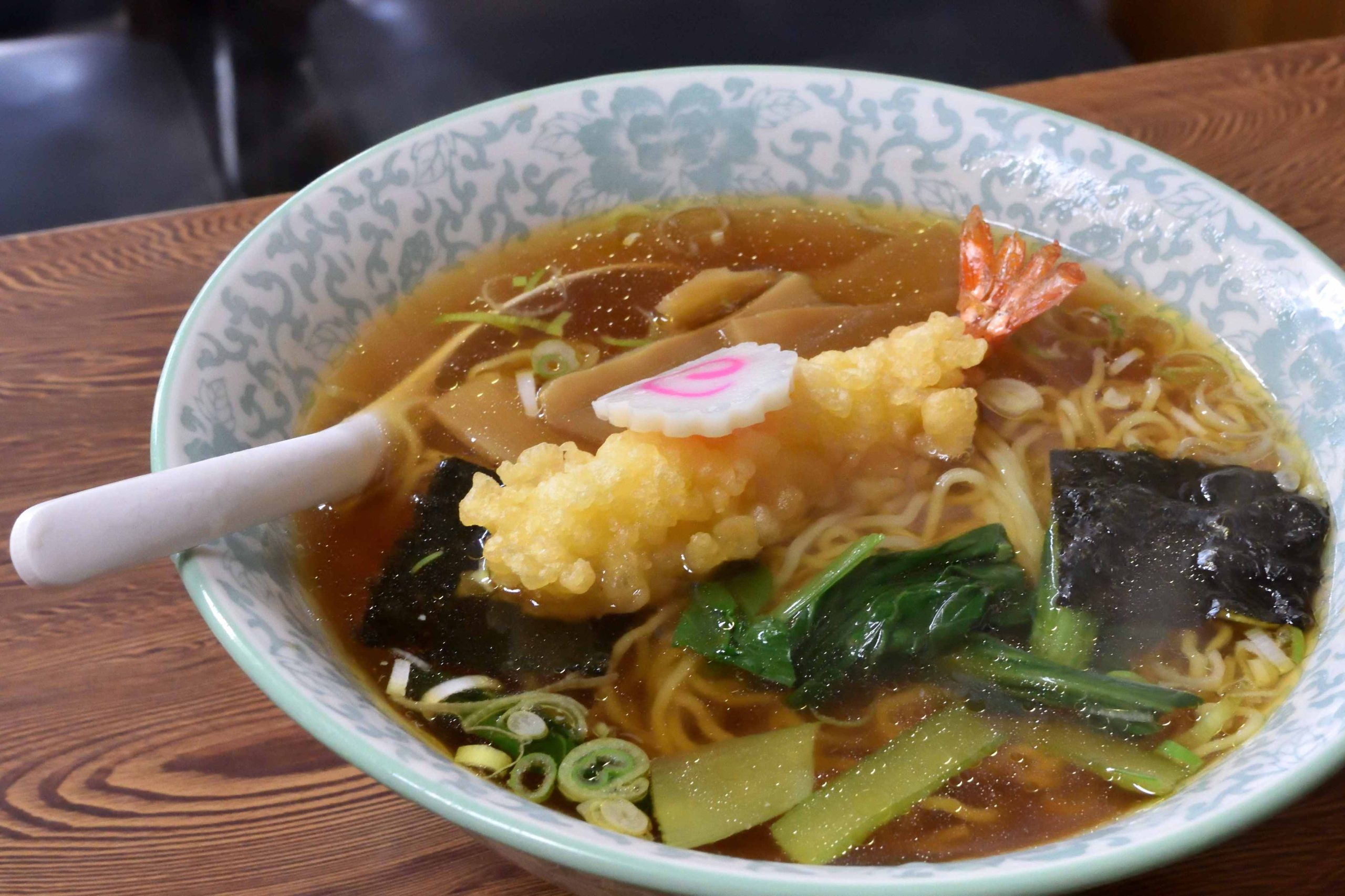 「たかの食堂」の名物といえば、知る人ぞ知る「天ぷら中華」です。トッピングはメンマ、ナルト、海苔、ネギなどの中華そばの定番に加え、なんとエビの天ぷらが!サクサクの衣に、特製の醤油スープがじゅわっと染み込み、唯一無二の美味しさを生み出しています。和風出汁が効いた濃い目のスープと天ぷらの相性は抜群で、まさに和風出汁の効いた中華という印象。一口食べれば、その斬新さと奥深い旨さに驚くこと間違いなしです。初めての人も、ぜひこの伝説のメニューに挑戦してみてください。