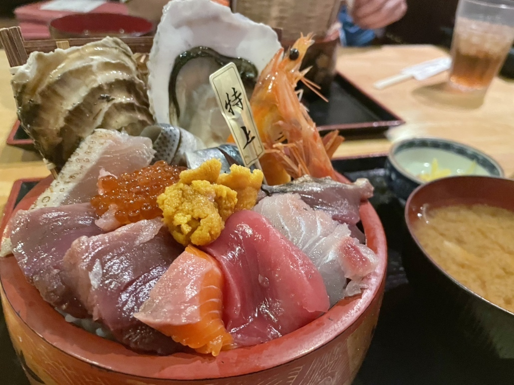 「和」の海鮮丼は、まずそのボリュームに誰もが驚愕!ご飯が見えないほどに敷き詰められたネタの山に、思わず「うお〜!」と声が出てしまうほどの迫力です。特上海鮮丼には、ウニ、つぶ貝、そして大きなイワガキなど、高級なネタがこれでもかとオン!一方のメガ海鮮丼は、一つ一つのネタがでっかい!厚切りのお刺身が惜しみなく盛られ、まさに太平洋の恵みを独り占めしている気分になれます。どちらも同じくらいの価格帯というのも嬉しいポイント。新鮮さはもちろん、「こんなに沢山の種類の海鮮を一度に食べられるなんて!」という贅沢感がたまりません。