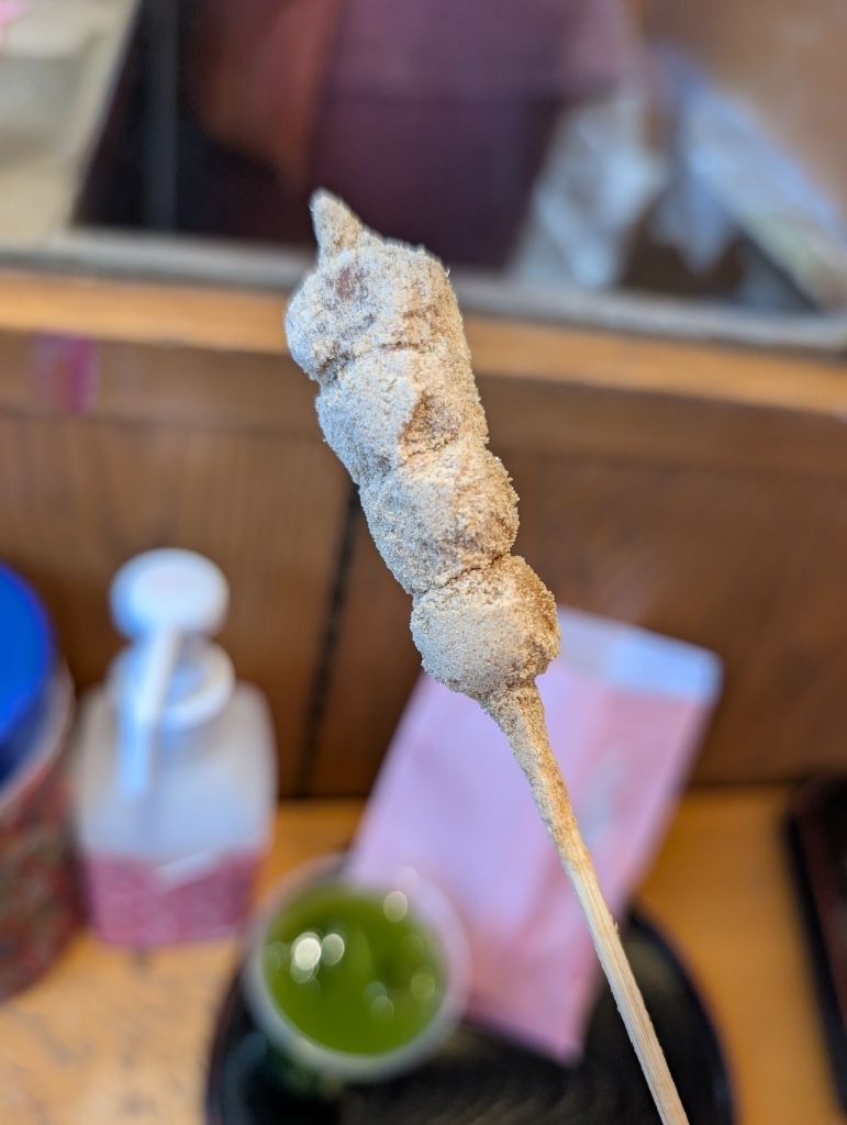 一人前は5本入り。最初は「ちょっと多いかな?」なんて思うかもしれませんが、それは大きな間違いです!実物は一口サイズの小さな可愛らしいお団子が4つ串に刺さっていて、その質量は普通のお団子1本分くらい。だから、女性でもお子様でもペロリと完食できちゃうんです。むしろ、2人でシェアしようとすると「足りない!」と争奪戦になること間違いなし。きめ細かなきびの風味と、絶妙な塩気が効いた甘すぎないきな粉が合わさって、もう無限に食べられそうな勢い。お餅も驚くほど柔らかく、口の中でモチモチとろける食感は、出来たてならではのご馳走です。袋の底に残ったきな粉まで「もったいない!」と感じてしまうほど、後を引く美味しさが詰まっていますよ。