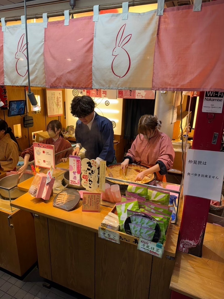 お店に近づくと聞こえてくる「いらっしゃいませ!」という元気な売り声。着物姿のスタッフさんたちがキビキビと働く姿は、まさに江戸時代の仲見世そのものです!目の前でお団子が茹で上げられ、たっぷりのきな粉にダイブする様子を眺めるのは、最高のエンターテインメント。ピンクのうさぎロゴが目印のパッケージも可愛くて、手に取るだけでテンションが上がっちゃいます。この活気あふれる雰囲気こそが、浅草観光の醍醐味ですよね。職人技のような手捌きで次々と出来上がるお団子を見ていると、待っている時間さえもワクワクするアトラクションに変わります。都会の真ん中で「粋」な心意気に触れられる、浅草ならではのパワースポットと言っても過言ではありません!